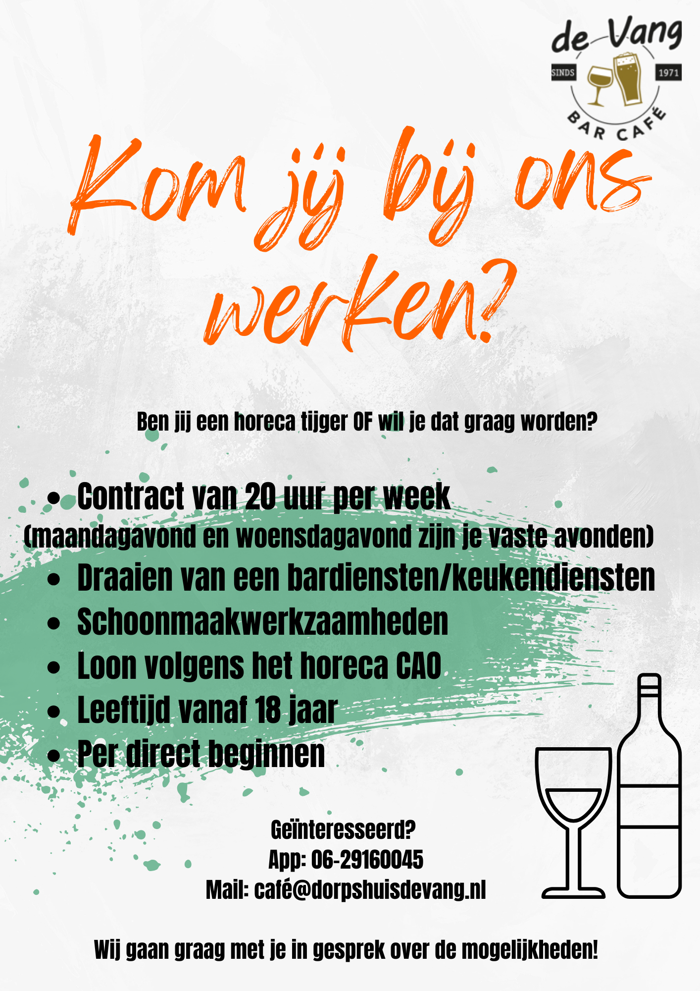 Werken bij de Vang Op deze pagina vind je alle vacatures bij Dorpshuis de Vang. Naar weekendkrachten zijn wij altijd op zoek. Heb je interesse? Dan kan je appen naar 06-29160045 Of mailen naar cafe@dorpshuisdevang.nl