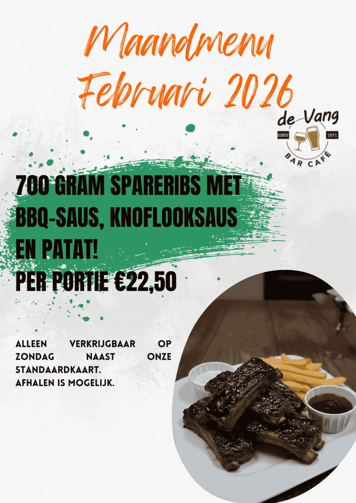 Zondags menu U kunt elke zondag bij ons dineren in het café vanaf 17.00uur tot 20.00uur. Heeft u ons wisselende maandmenu ook gezien? Afhalen is ook mogelijk via het volgende nummer: 0229 591479